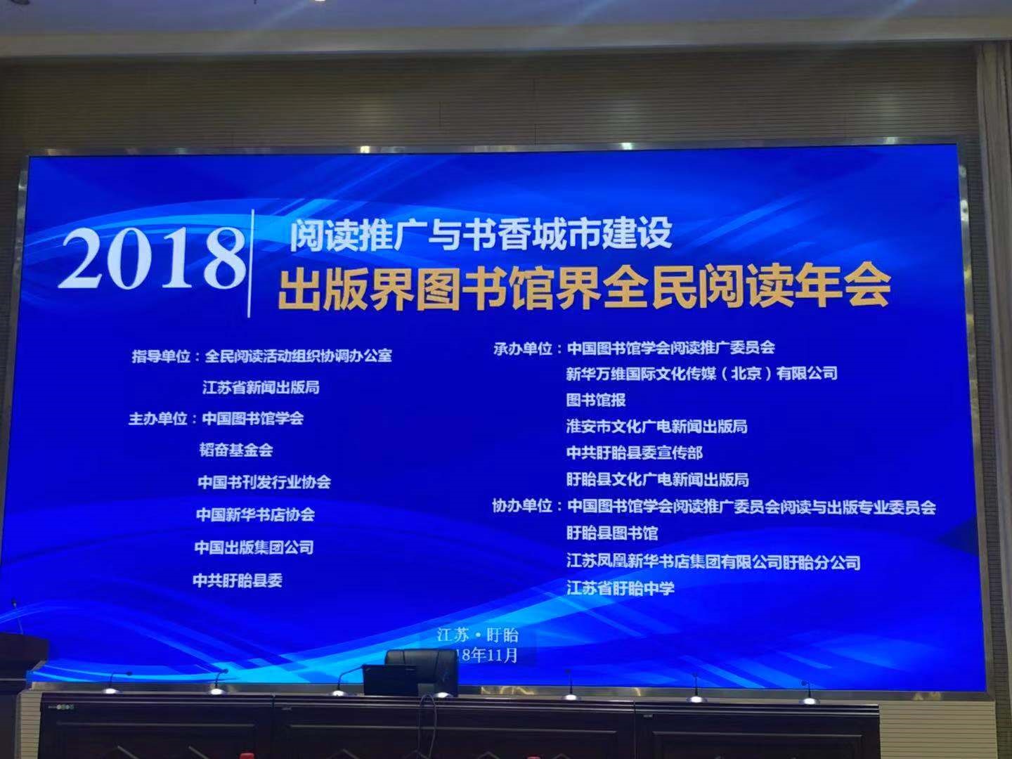 11月23日,由中國圖書(shū)館學(xué)會(huì )、韜奮基金會(huì )、中國書(shū)刊發(fā)行業(yè)協(xié)會(huì )、中國新華書(shū)店協(xié)會(huì )、中國出版集團公司主辦的“2018出版界圖書(shū)館界全民閱讀年會(huì )”在江蘇盱眙舉辦。本屆年會(huì )以“閱讀推廣與書(shū)香城市建設”為主題,邀請出版界、發(fā)行界、圖書(shū)館界200余位嘉賓出席,為推進(jìn)全民閱讀建言獻策。